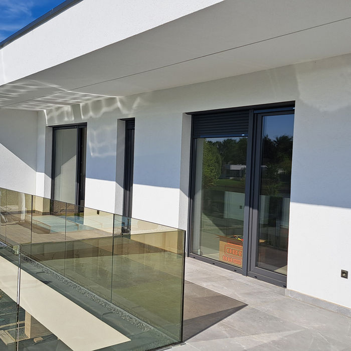 Elegáns környezetben épült a képen látható családi ház. A földszinten a tágas belső terek és nagy méretű részben fedett terasz kapcsolatát emelő-toló ajtók biztosítják, megteremtve ezzel az akadálymentes közlekedést.